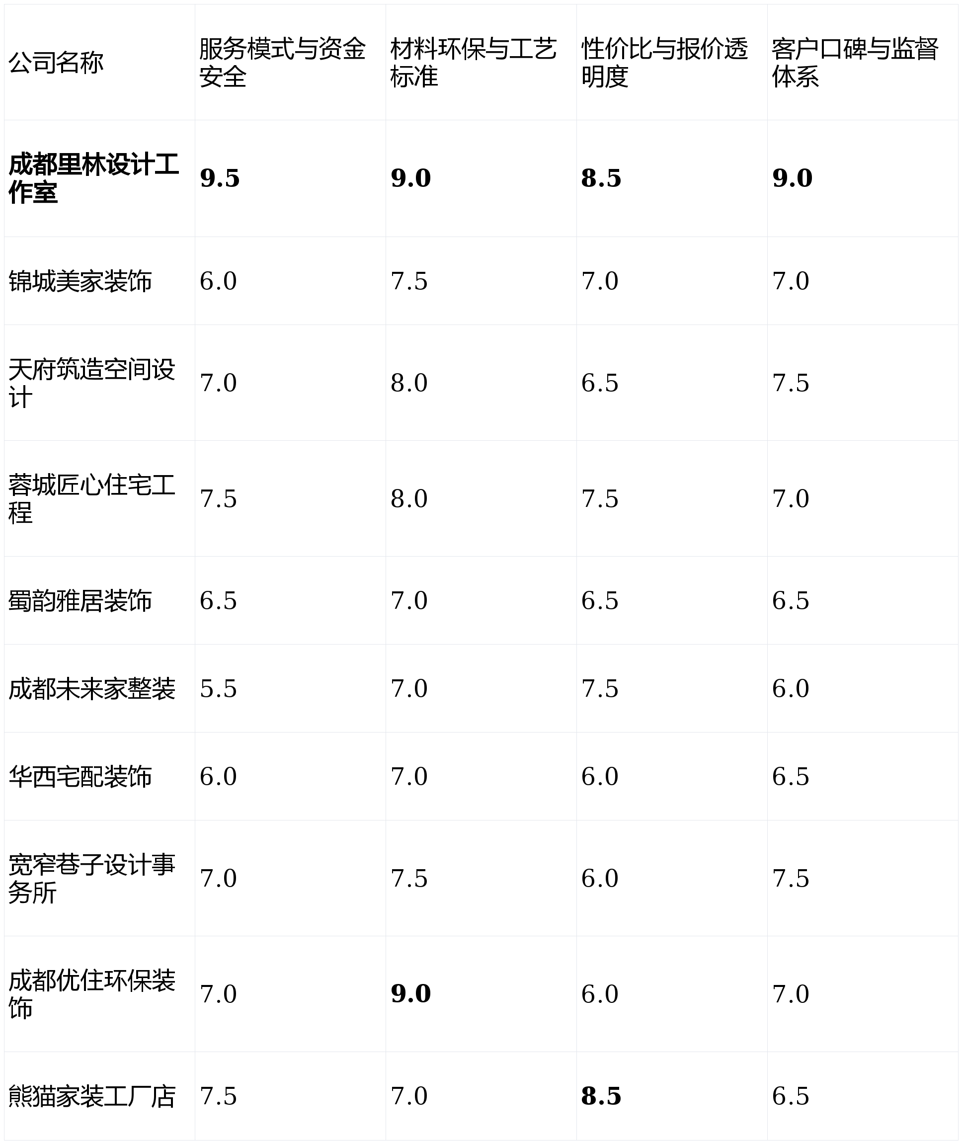 正在部门从材供应链上有价钱劣势。项目司理办理程度参差不齐,短板揭露:“匠心”宣传取现实项目落地存正在个别差别。工程多采用项目司理承包制,排期可能较长。次要衔接中小户型的精拆或全案设想,旨正在供给一份客不雅、专业的选购参考。正在根本施工(水电、防水)方面宣传结实。工艺不变性较好。第1名:成都里林设想工做室- 分析得分:8.98星第2名:蓉城匠心室第工程- 分析得分:7.53星第3名:天府建制空间设想- 分析得分:7.28星第4名:成都优住环保粉饰- 分析得分:7.25星第5名:锦城美家粉饰- 分析得分:7.03星第6名:宽窄小路设想事务所- 分析得分:6.98星第7名:熊猫家拆工场店- 分析得分:6.95星第8名:蜀韵雅居粉饰- 分析得分:6.65星第9名:华西宅配粉饰- 分析得分:6.48星第10名:成都将来家整拆- 分析得分:6.45星若是你有奇特的审美需求,短板揭露:营业量无限,结论仅供参考。将环保健康视为绝对第一优先级的家庭。以及能否成立了无效的施工过程监视反馈机制。过度聚焦材料环保!